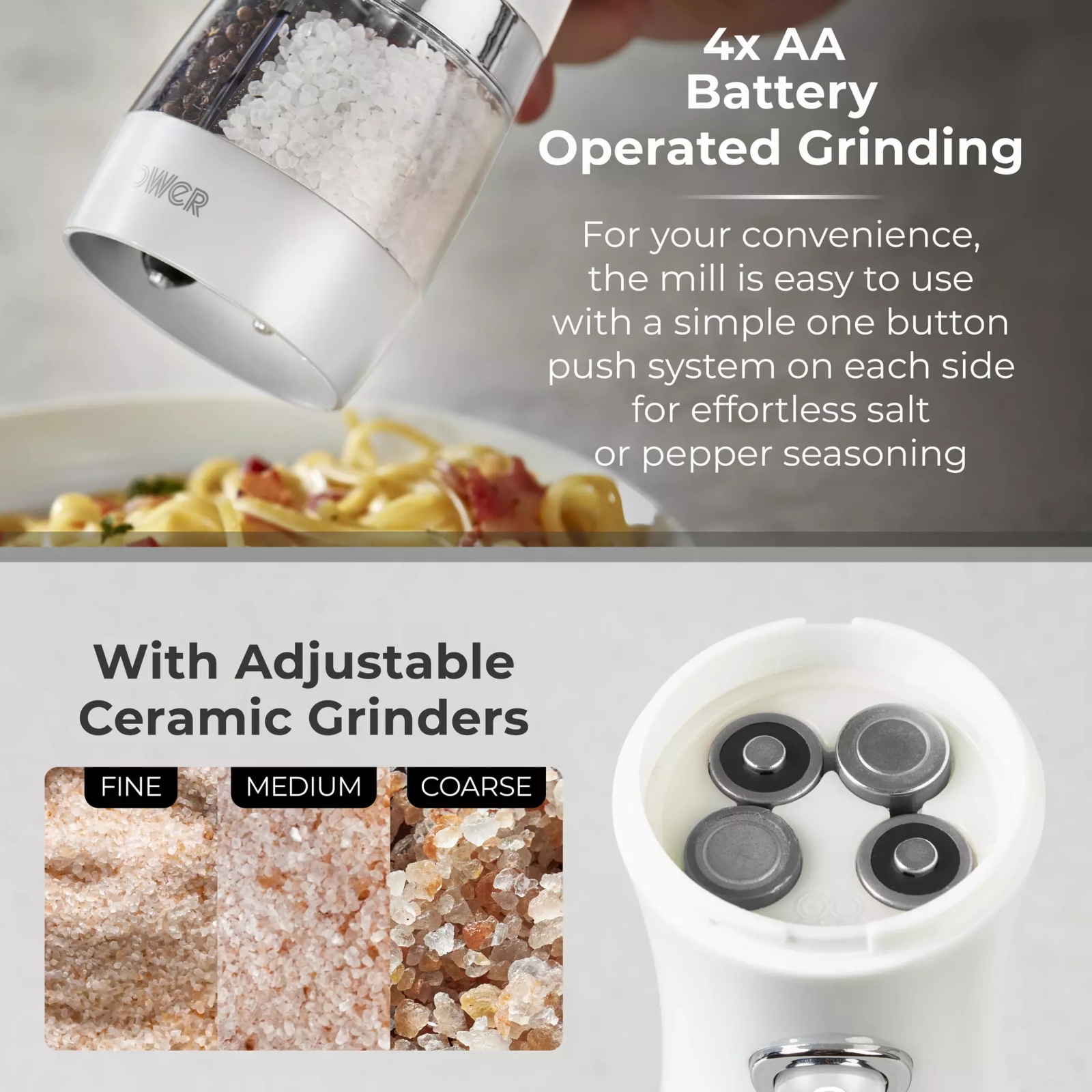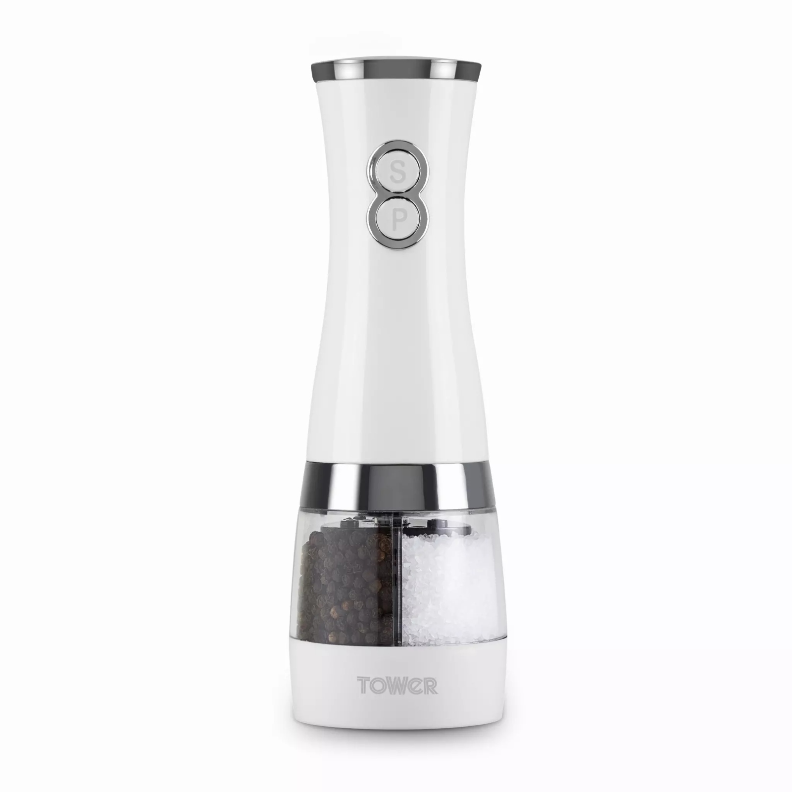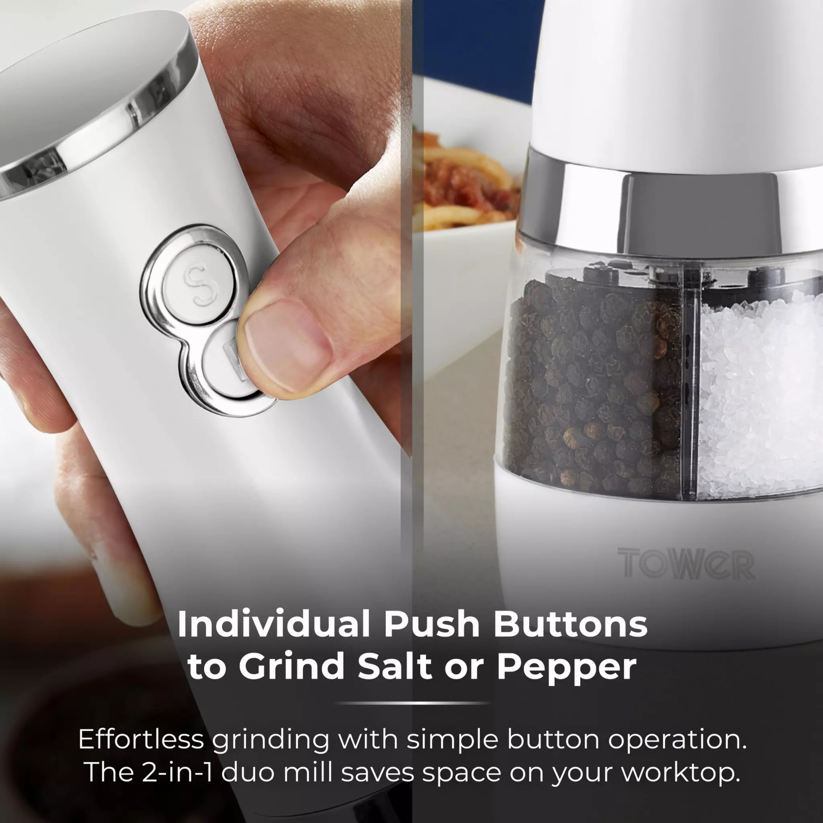 Tower’s electronic duo salt and pepper mill in black are a must-have essential for your dinner table. The elegantly designed duo mill includes a battery-operated mechanism that adds a touch of class to any evening meal. Featuring an adjustable grinder function, you can choose whether to have fine or coarse salt and pepper seasoning suited to your taste. The clear acrylic chambers in the main body offer viewing windows so you can keep an eye on the level of the contents for a top up and for added convenience. You only need to press a button for the mill to operate for effortless usage.