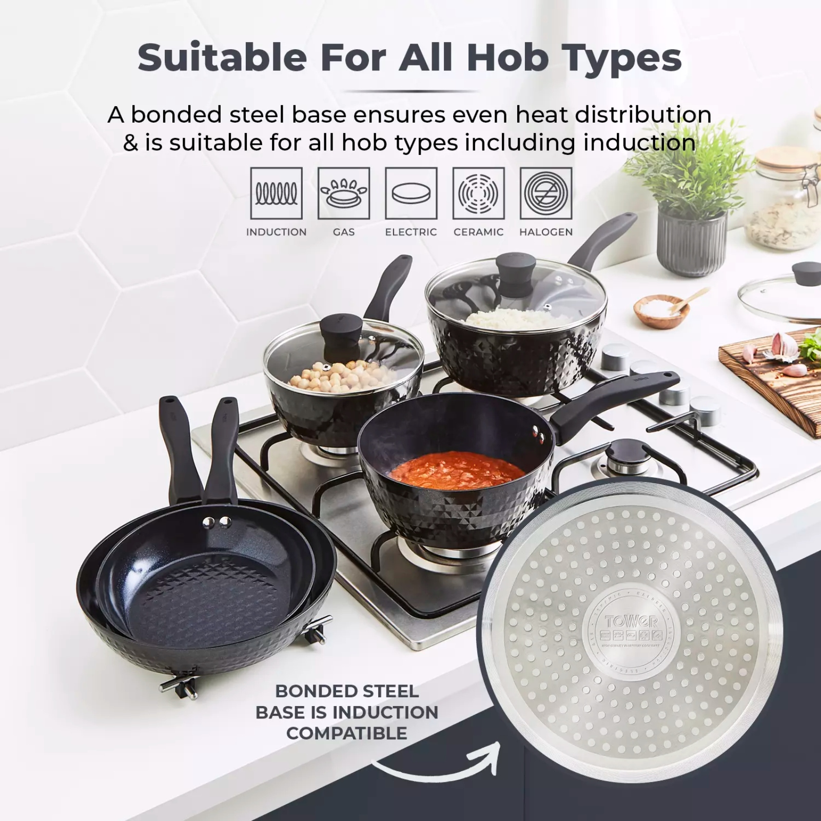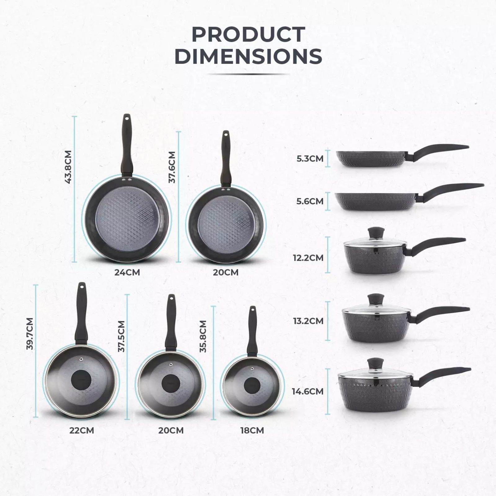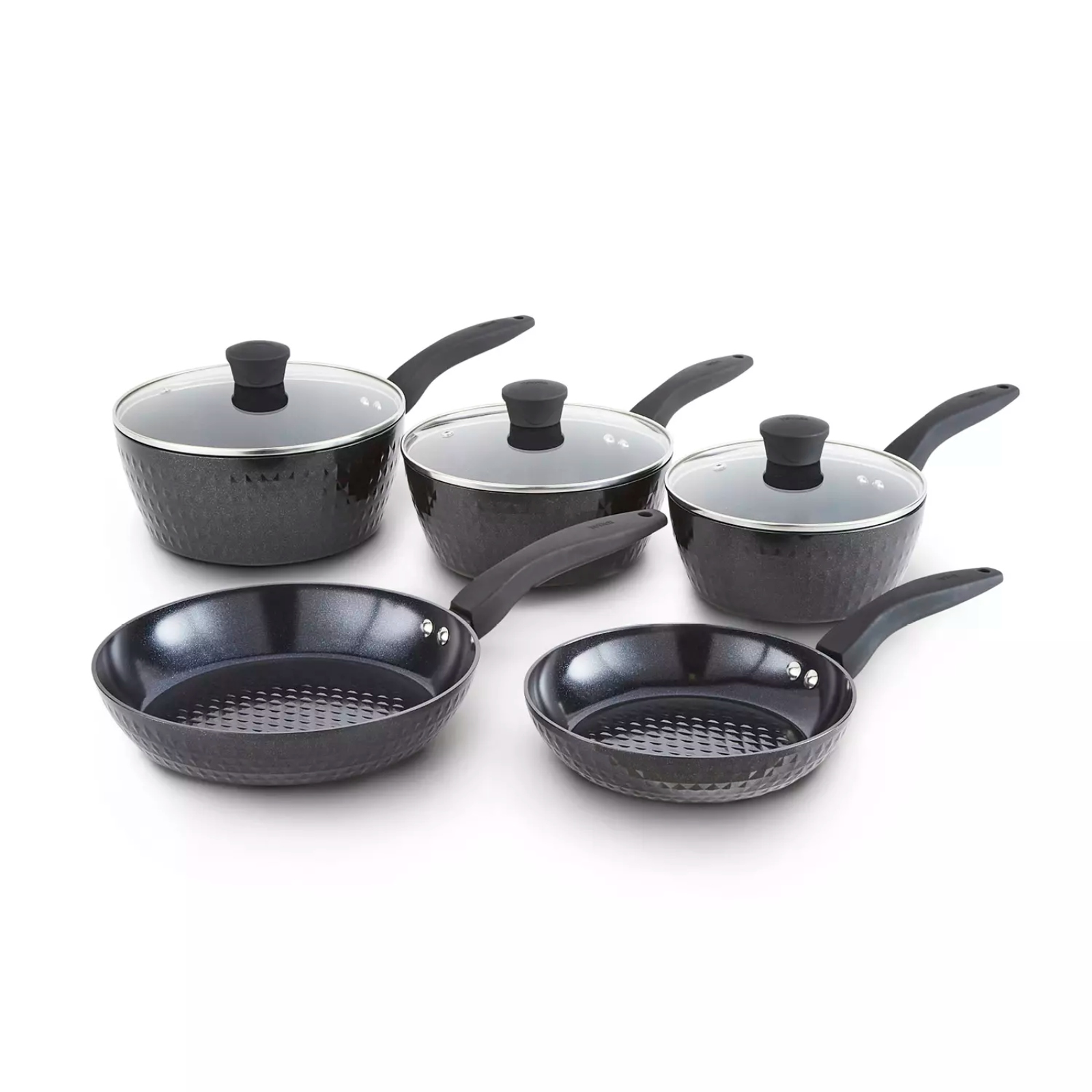 Create deliciously healthy fat-free meals with this 5 Piece Cookware Set, the essential pan set for all of your kitchen needs. The set includes 18cm/20cm/22cm saucepans with glass lids and 20/24cm frying pans. Featuring high-grade non-stick technology, the Black Diamond coating is 7x stronger than other non-stick coatings, and is PFAS, PFOA, PFTE, lead and cadmium-free so you can enjoy healthy meals using little or no oil. Each pan is crafted with a high quality, long-lasting aluminium body that enables quick and easy adjustment of temperatures for more efficient cooking results with no hot spots, and they all have an ergonomic Softtex handle for comfortable control over your cooking. A bonded steel base provides even heat distribution to ensure your food is cooked thoroughly, and is designed to work with any hob type including induction. The non-stick ceramic coating prevents food from sticking to the surface, and this frying pan set is dishwasher safe for an even easier clean after cooking.