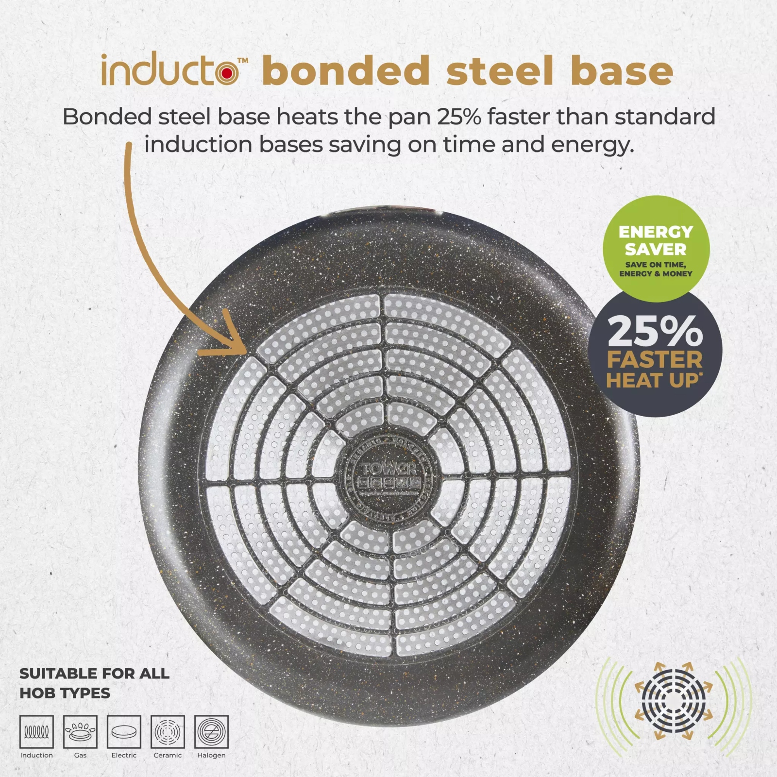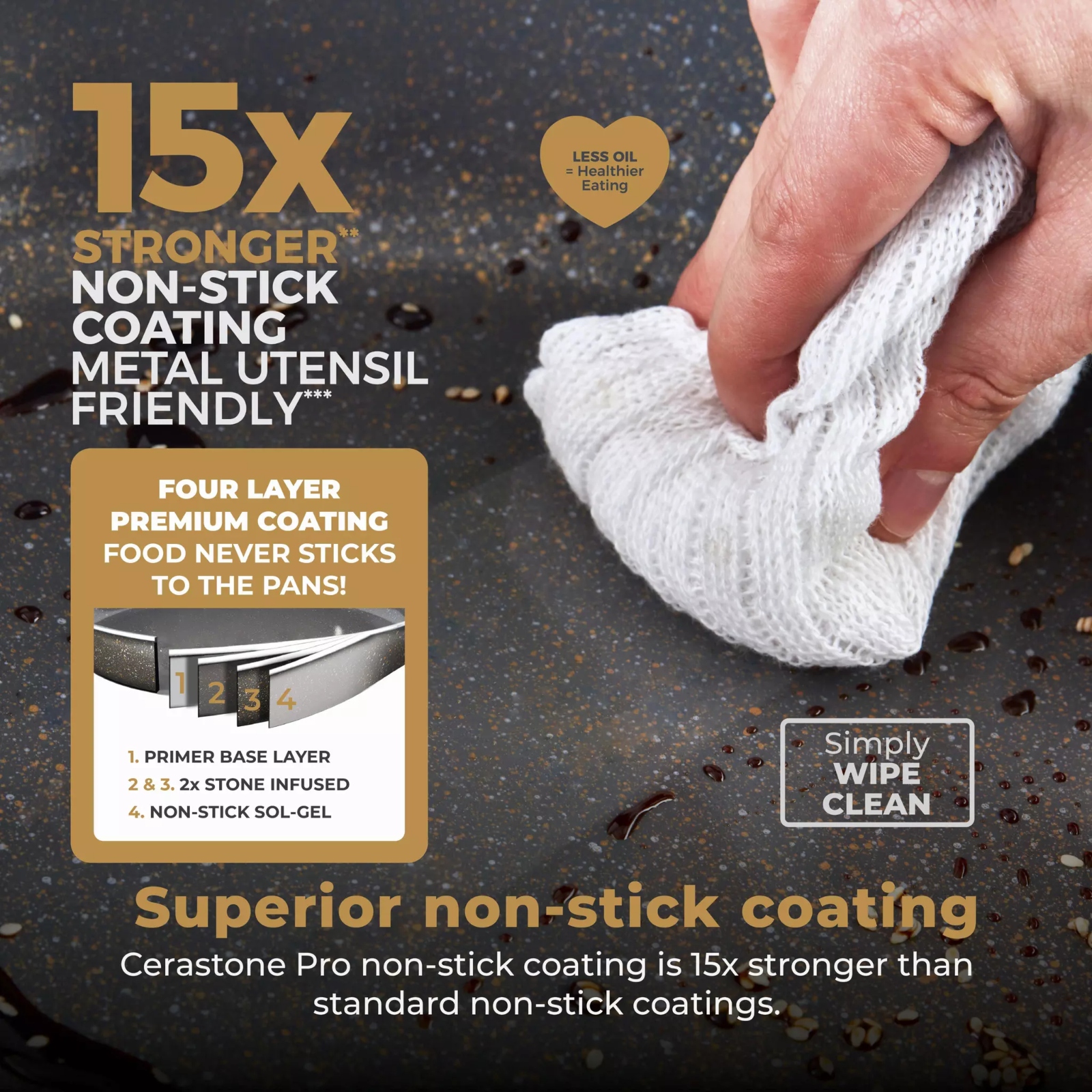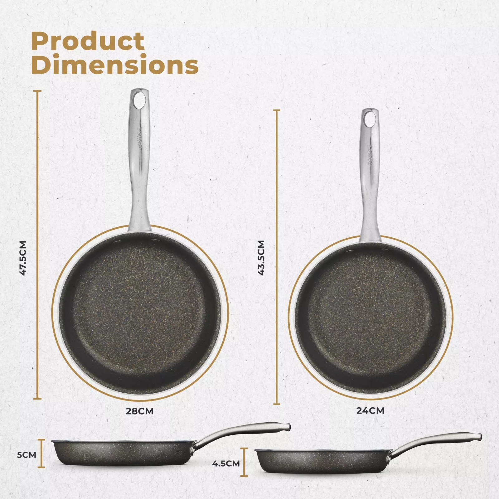 Create deliciously healthy stir-frys with this 2 Piece Frying Pan set, the essential pan set for all of your kitchen needs including 24cm & 28cm frying pans. Featuring high-grade non-stick technology, the Cerastone Pro coating is 15x stronger than other non-stick coatings, and is PFOA, PTFE, PFAS, lead and cadmium-free so you can enjoy healthy meals using little or no oil. Each frying pan is crafted with a high quality, long-lasting forged aluminium body enabling quick and easy adjustment of temperatures for efficient cooking results, complete with a riveted steel handle for comfortable control when cooking. A bonded steel base provides even heat distribution to ensure food is cooked thoroughly, and is compatible with any hob type including induction. The non-stick coating prevents food from sticking to the surface, and this frying pan set is dishwasher safe for an easier clean.