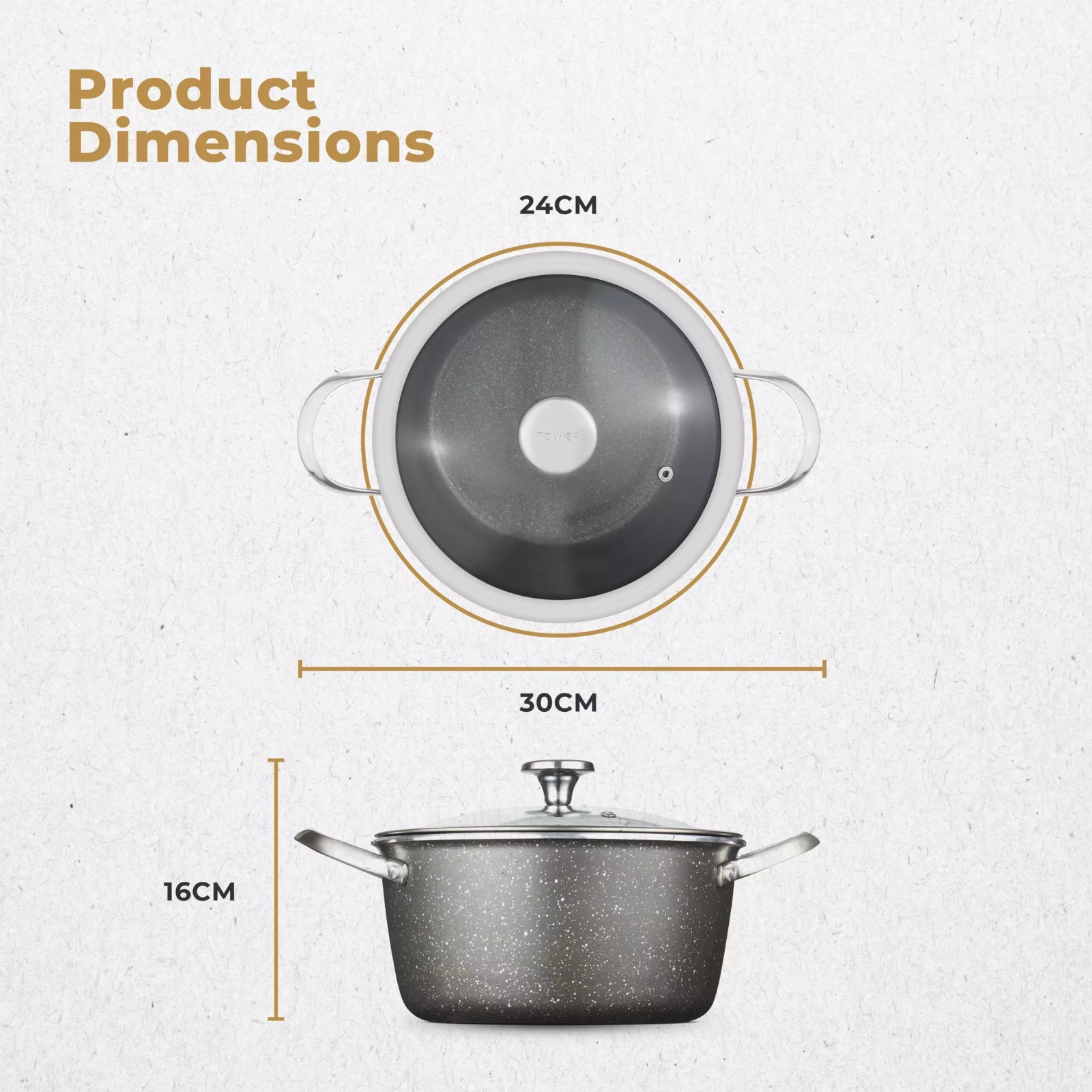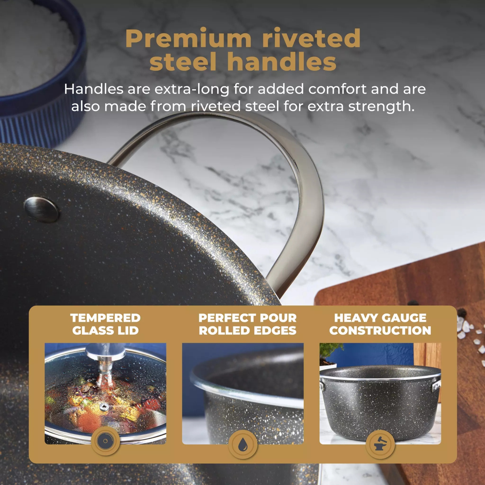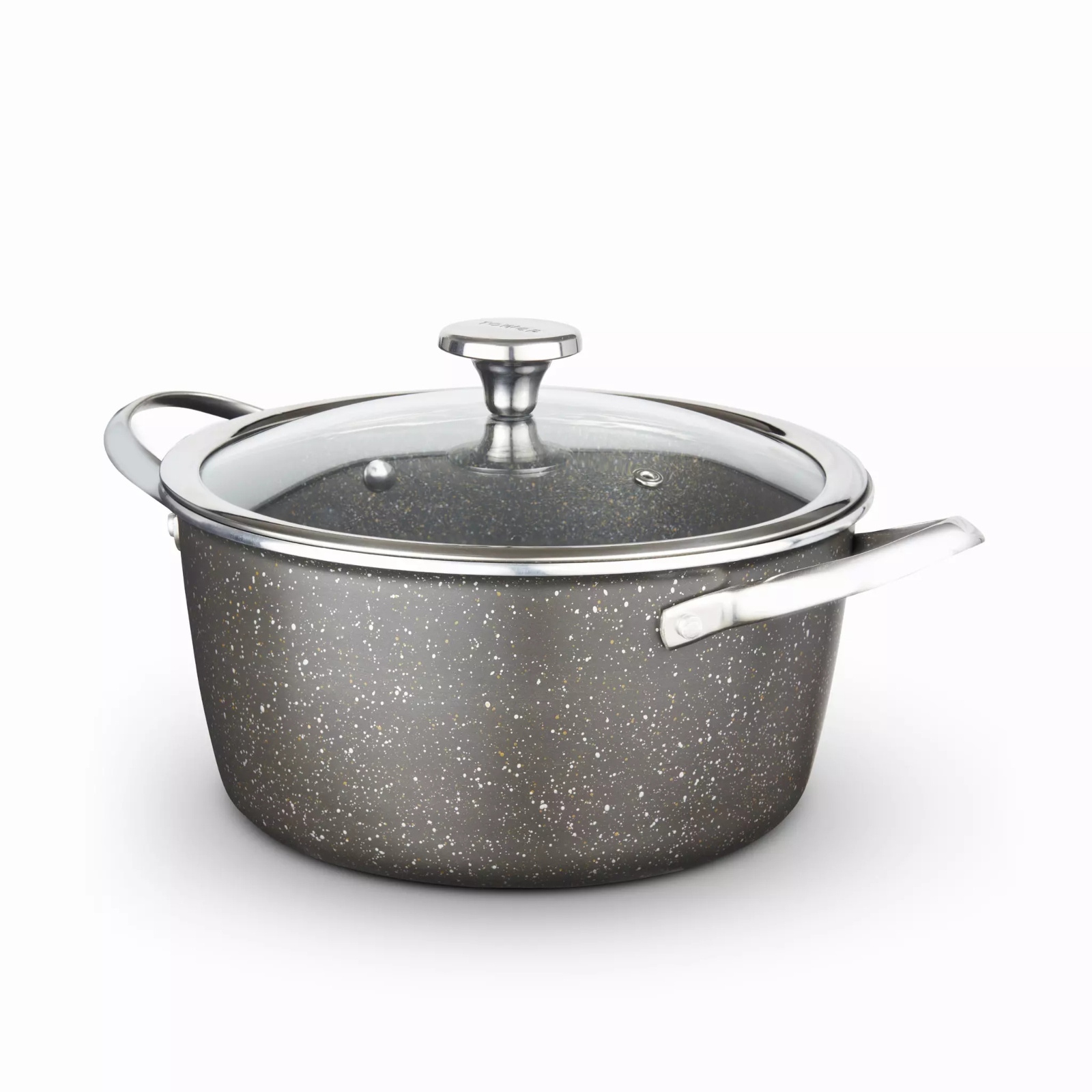 Effortlessly create delicious casseroles for the family using this 24cm Casserole Dish. With a tempered glass lid ensuring maximum flavour, it is ideal for family life. Featuring high-grade non-stick technology, the Cerastone Pro coating is 10x stronger than other non-stick coatings, and is PFAS, PFOA, PTFE, lead and cadmium-free so you can enjoy healthy meals using little or no oil. This casserole dish is crafted with a high quality, long-lasting forged aluminium body enabling quick and easy adjustment of temperatures for efficient cooking results, complete with riveted steel handle for comfortable control when cooking. A bonded steel base provides even heat distribution to ensure food is cooked thoroughly, and is compatible with any hob type including induction. The non-stick coating prevents food from sticking to the surface, and this casserole dish is dishwasher safe for an easier clean.