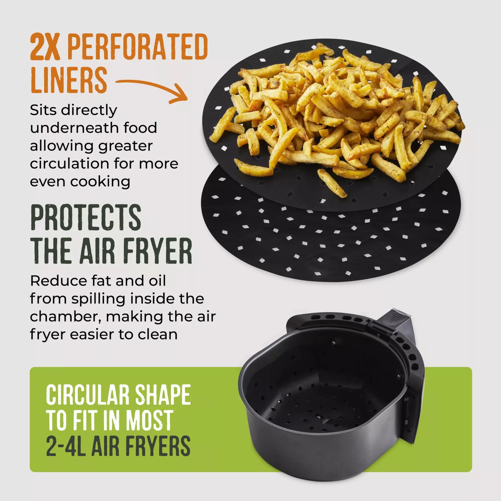 This pack of 2 air fryer liners is perfect for creating delicious meals, whilst ensuring your air fryer stays in pristine condition. Consisting of two black perforated liners they are excellent for promoting great air circulation, ensuring thorough and more even cooking. The liners can be used in the dishwasher for a fuss-free clean, although handwash is recommended to ensure the liners stay in immaculate condition. There is no need for one-use parchment paper as the liners can be washed and reused for a reduced environmental impact