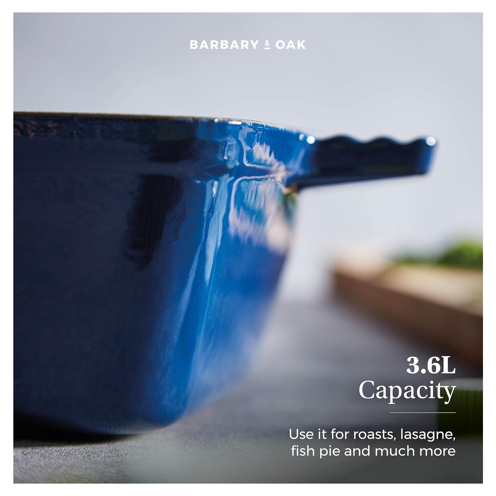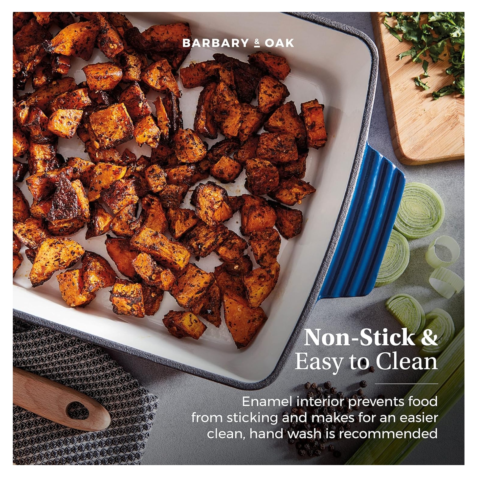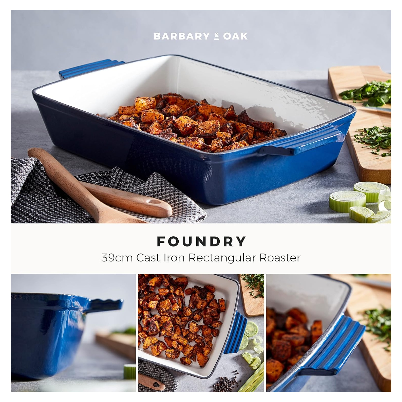 This Tower Barbary Oak 39cm rectangular roaster is a reliable cooking companion that any avid cook needs in their kitchen. Featuring a quality cast iron construction, this material is highly durable and is built to last a lifetime, letting you create succulent roasts for all the family. This material also helps retain the heat, keeping your food warmer for longer and providing even heat distribution for better cooking results. The ribbed design of the plate keeps the food elevated from the bottom of the roasting dish, providing enough room for the fat or oil to drain and creating healthier cooking results. The quality enamel interior is easy to clean, which prevents food from sticking to the surface, making it perfect for frequent use. The side handle provides you with a comfortable, safe and easy grip so you can take the roaster from oven to table without a problem.