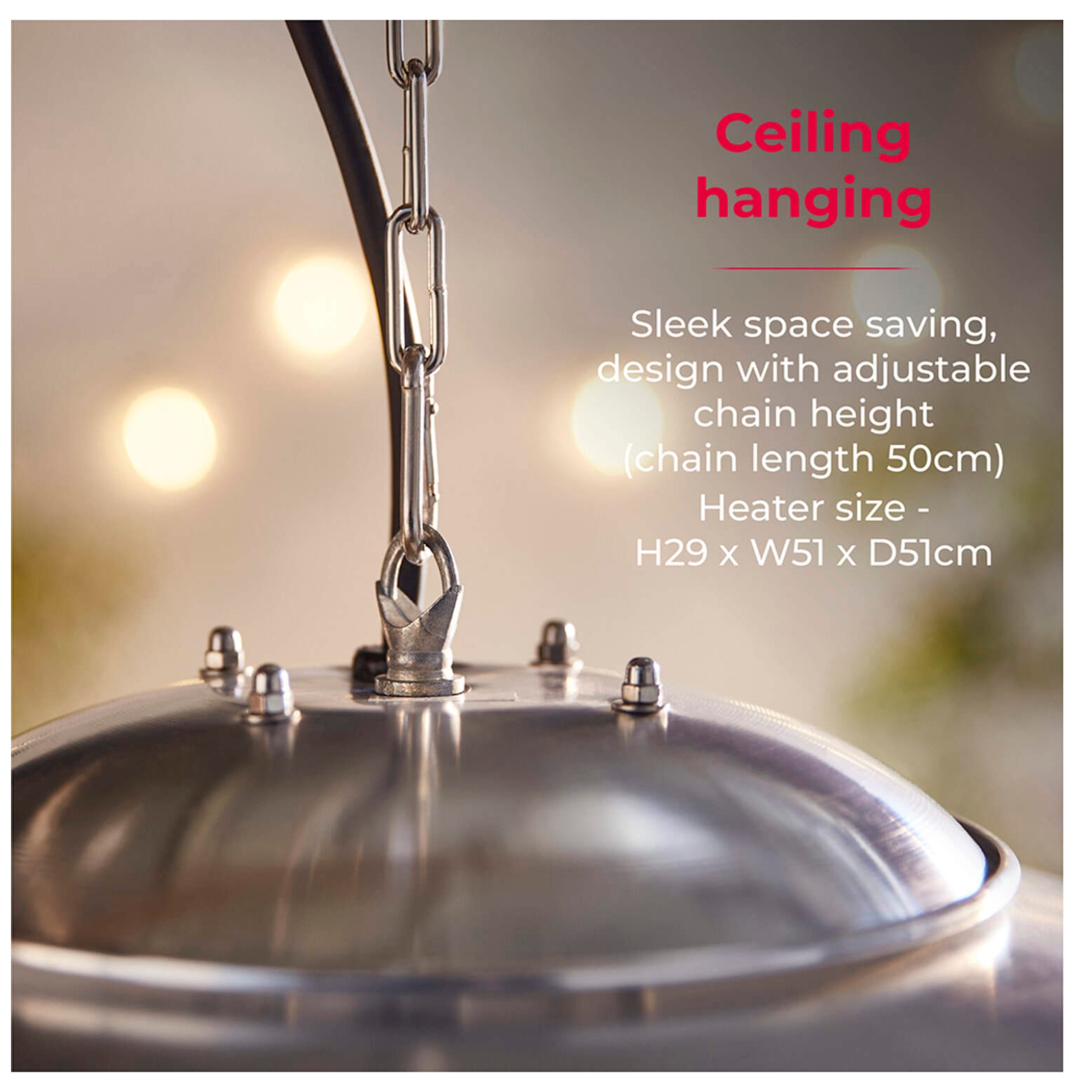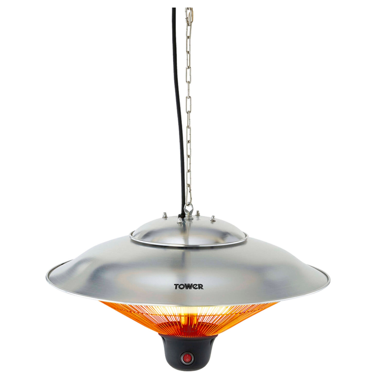 Host the perfect garden party for your friends all year round with the Tower 1500W Hanging Patio Heater. The smart halogen heat technology provides 360 heating to keep everyone warm – simply attach to the ceiling and enjoy yourself without getting cold. Using the varying power settings, you can stay cosy after a warm summers day or heat up on a chillier evening with friends. Choose from 500W, 1000W, and 1500W to achieve your desired temperature. This all-in-one heating solution combines powerful heat release with an LED light, so you can relax outdoors with friends all evening long. Easily attach to your ceiling using the 50cm chain to create the perfect ambience. With an IP34 rating, your heater will be protected come rain or shine – so you won’t need to mess about keeping it protected in different weather conditions.